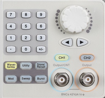 Генераторы представляют собой лабораторные многофункциональные измерительные приборы, принцип действия которых основан на технологии прямого цифрового синтеза, который позволяет получать стабильные, высокоточные сигналы с низким коэффициентом нелинейных искажений практически любой формы. На передней панели генератора находится цветной жидкокристаллический дисплей, на котором отображается форма генерируемого сигнала и его параметры. Под дисплеем находится ряд кнопок управления меню, с помощью которых пользователь может задать параметры различных форм сигналов. В нижней правой части панели расположены выходные разъемы двух каналов и кнопки выбора канала. Рядом с выходными разъемами находится блок кнопок, используемых для выбора и сохранения форм сигналов, включения режимов модуляций и вызова меню настроек прибора. Для ввода цифровых параметров на панели имеется три группы органов управления: кнопки направлений (со стрелками), вращающийся регулятор параметров и цифровая клавиатура. На задней панели генератора имеется разъем для подключения шнура питания, интерфейс USB — для управления через ПК, входные разъемы: опорной частоты 10 МГц, сигнала внешней модуляции и сигнала запуска, выходные разъемы: опорного генератора 10 МГц, сигнала запуска и сигнала синхронизации.